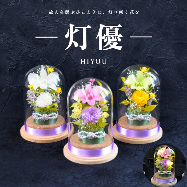 お供え用のプリザーブドフラワーアレンジメントです。 電球色の光がやさしく輝きます。 サイズ:(約)幅12cm×高さ21cm