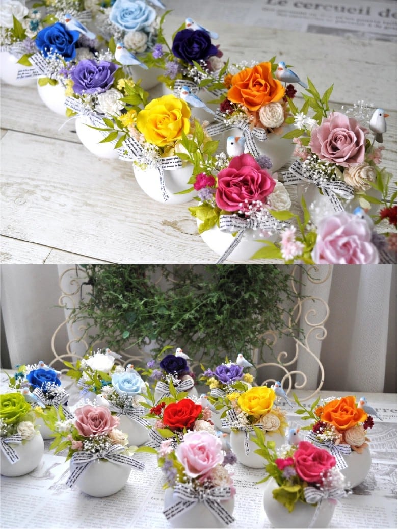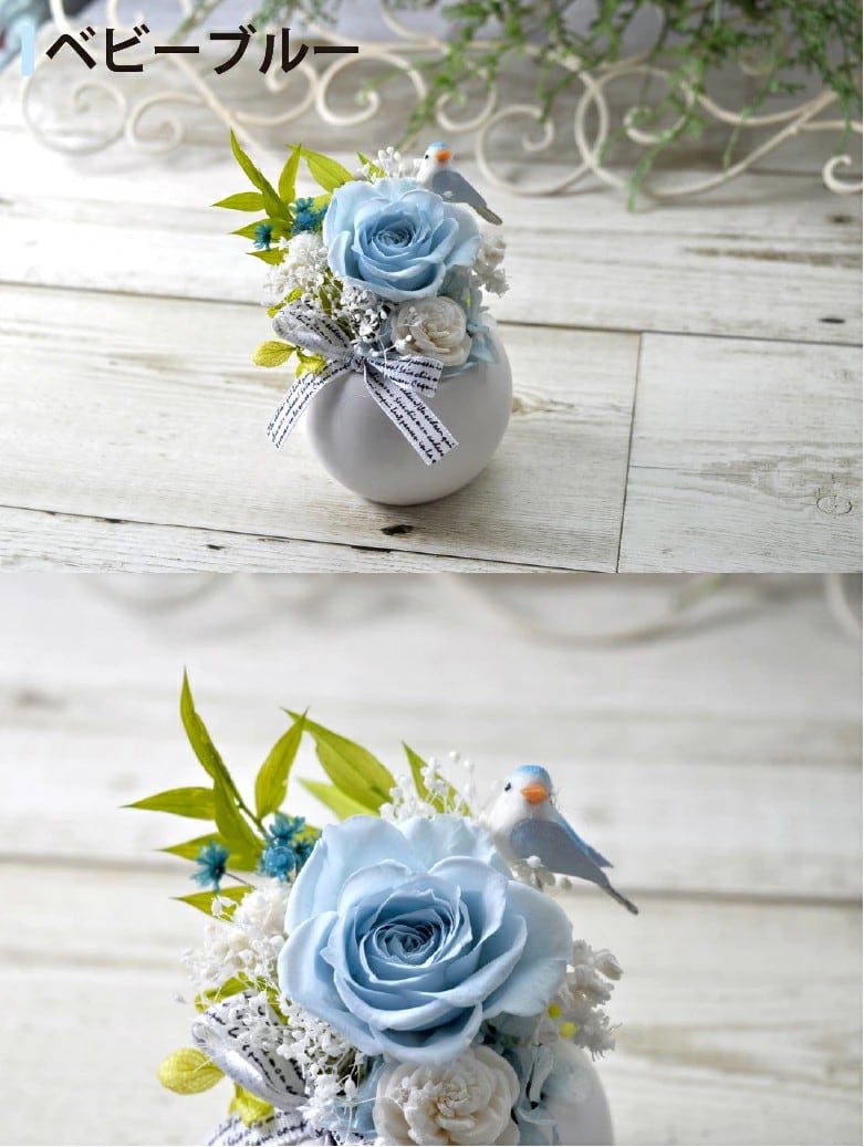 青い鳥をモチーフにしたプリザーブドフラワーは、12色から選べる豊富なカラーバリエーションが魅力です。小さな器にぎゅっと詰め込まれたデザインは、場所を取らず、どんな空間にも自然に溶け込みます。ナチュラルな雰囲気を持ち、小花が散りばめられたこのフラワーアレンジメントは、結婚記念日や誕生日、還暦祝いなど、さまざまなシーンでの贈り物に最適です。特に女性や妻へのプレゼントとして、心温まるメッセージカードを添えて贈ると喜ばれることでしょう。