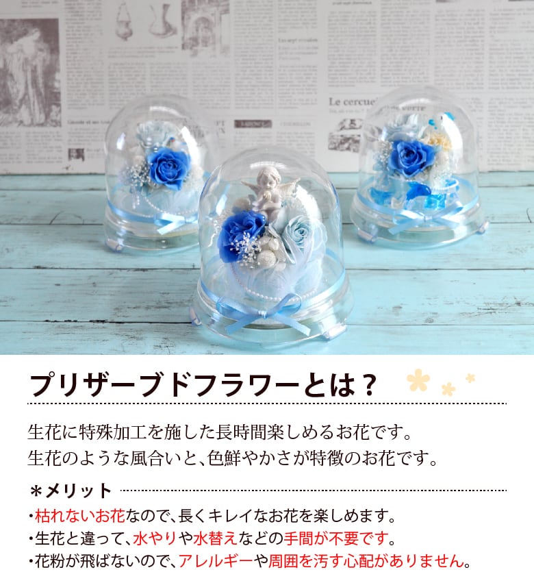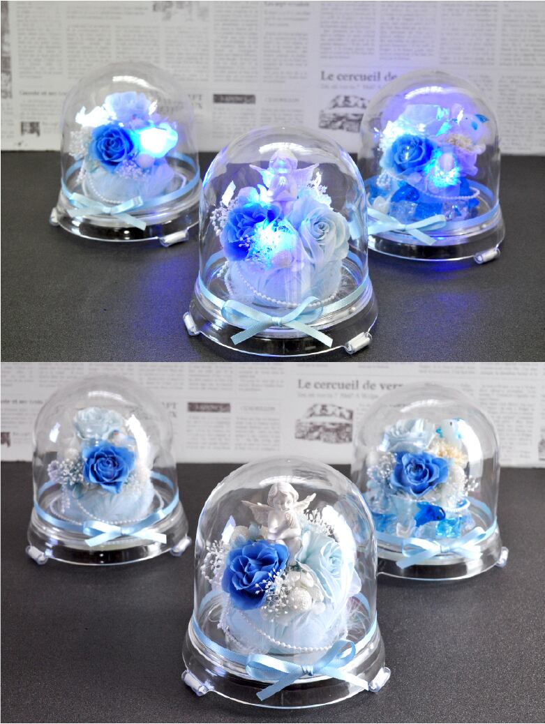 幻想的な青い光が魅力の「プリザーブドフラワー ブルーシンフォニー」は、特別な日の贈り物に最適です。青いLEDが花を優しく照らし、幸運を呼ぶ青い鳥や天使、ドルフィンが飾られたデザインは、見る人を魅了します。結婚記念日や誕生日、プロポーズなど、さまざまなシーンで喜ばれることでしょう。おしゃれでかわいいこのフラワーギフトは、大切な方への感謝の気持ちを伝えるのにぴったりです。