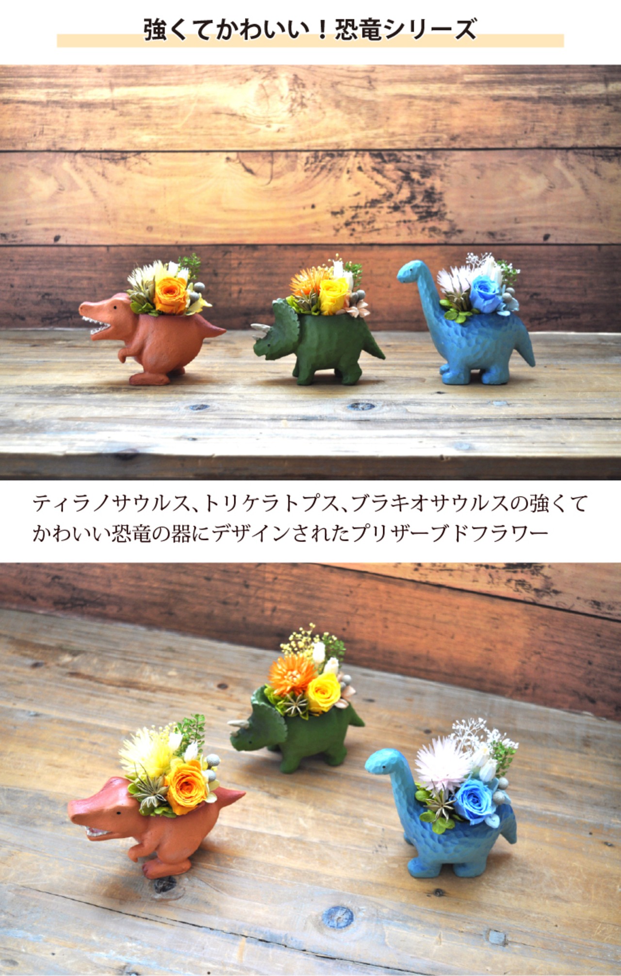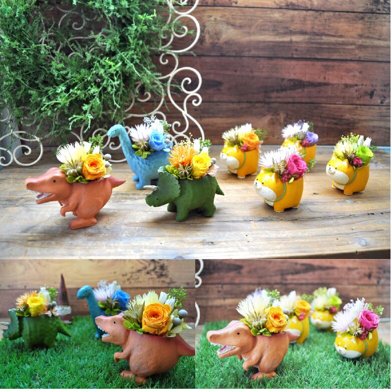 「プリザーブドフラワー 花 よちよちアニマルズ」は、結婚記念日や誕生日のお祝いにぴったりのギフトです。かわいいティラノサウルスやトリケラトプス、ブラキオサウルス、柴犬、パンダなどの動物たちが、色とりどりのプリザーブドフラワーを背負っている姿がとってもキュート!メッセージカードも付いているので、特別な思いを伝えるのに最適です。女性にも男性にも喜ばれるサプライズプレゼントとして、心に残るひとときを演出します。