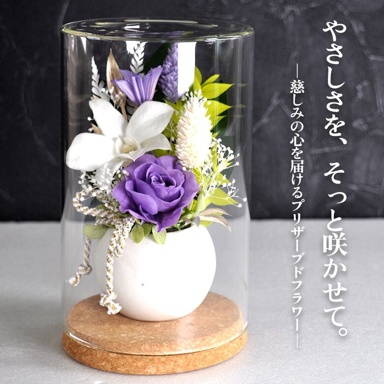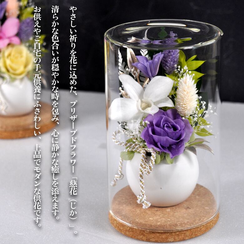 「慈花(じか)」は、ガラスボトルに優しく包まれたプリザーブドフラワーのお供え花です。