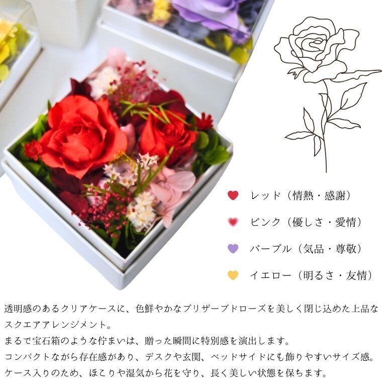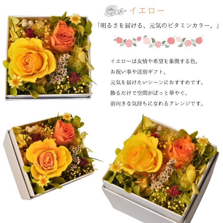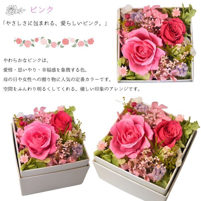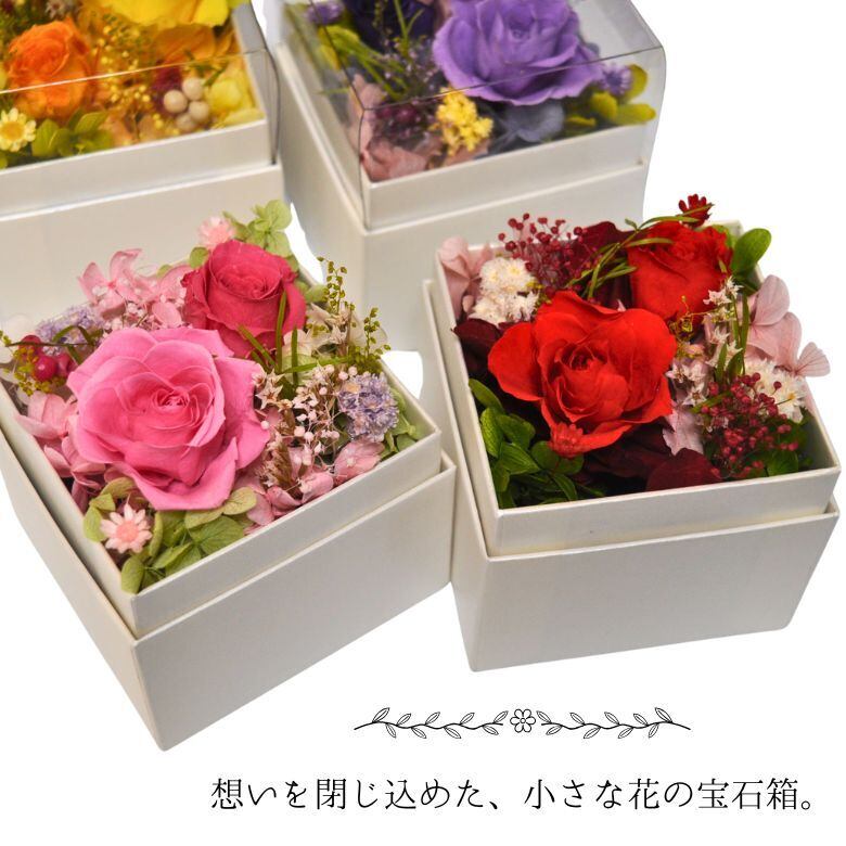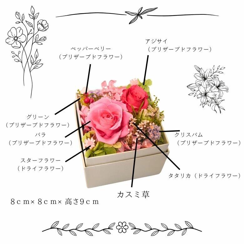 使用している花は、生花を特殊加工したプリザーブドフラワー。水やり不要で長期間美しい状態を保つ「枯れない花」として人気があり、ギフトにも最適です。